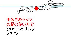 また、『両足同時にかかとで蹴り出すと、どうしてもうまく進まない』場合は、クロールのキックを、平泳ぎの足の使い方で交互に蹴る訓練をすると良い。
