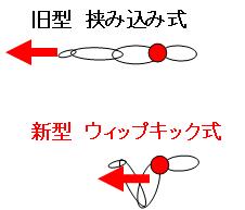 ところが、新型のウィップキックでは、名前の由来通りにムチがシナるような動作に近く、膝をまっすぐ上に押し上げる事で水平に足が押し開かれるようになっている(この事で、ウィップキックを使った泳法では「膝で泳いでいる」感覚が強い)。 結果的に膝への負担も旧型(回転挟み込み式)より少ない。